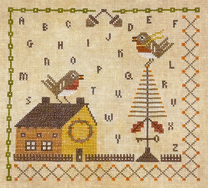 Humble Homestead Sampler - Acorns, twigs and bittersweet berries frame this Humble Homestead...and perched upon a tree and the rooftop, a pair of robins enjoy a snack. A twig wreath adorns the front of the tiny home and a small key and oak leaves perfectly trim the base of the tree in the fenced yard. The prim uppercase alphabet completes this modest sampler that is simply stitched in rich Autumn shades!